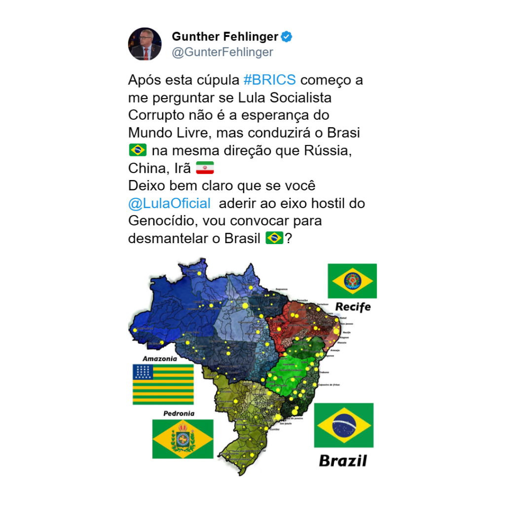 O tweet de Fehlinger começou criticando Lula como “Socialista Corrupto” e especulou sobre a possibilidade de ele levar o Brasil na mesma direção de nações como Rússia, China e Irã. O usuário também ameaçou que se Lula se juntasse ao que ele chamou de “eixo hostil do genocídio”, ele apelaria pela desmontagem do Brasil. Essa declaração provocou uma onda de reações mistas de usuários das redes sociais, provocando debates acalorados sobre política, ideologias e a relação do Brasil com outros países.
